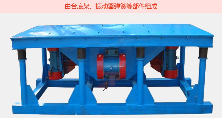 混凝土振動(dòng)臺(tái)主要由臺(tái)底架、振動(dòng)器彈簧等部件組成,臺(tái)面與底架均用鋼板和型鋼焊接而成,振動(dòng)臺(tái)是用電動(dòng)機(jī) 加一對相同的偏心輪組成。并通過一對吊架聯(lián)軸器安裝在臺(tái)面(反面)中心位置,起著振實(shí)過程中平穩(wěn)、垂直方向的作用。